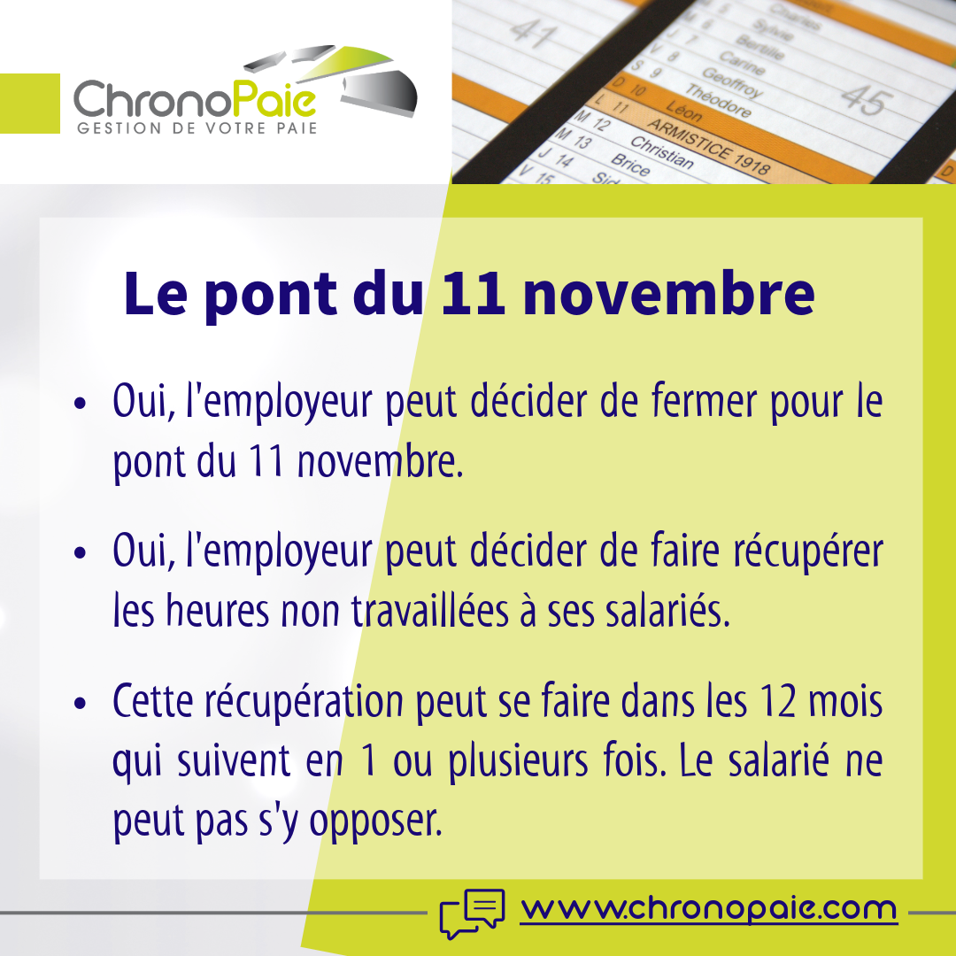 Oui, L’employeur peut décider de fermer l’entreprise le lundi pour le pont du 11 novembre.